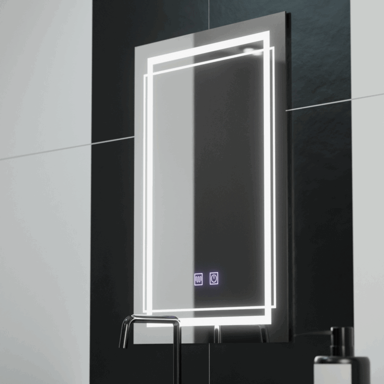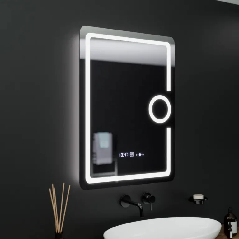 Oglinda LED Rectangulara, 60x80cm, Eclat MotionGlow Marcello, Ceas & Termometru, Sistem Dezaburire, Lupa Cosmetica, Dimabila